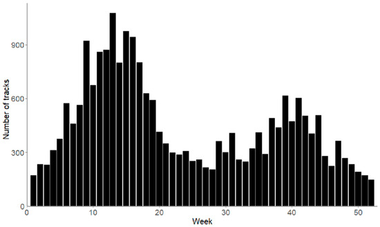 Histogram showing the seasonal distribution of the number of sea crossings (tracks). Week 1 = first week of January.