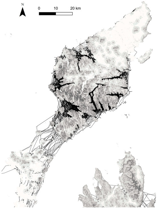 Movements of satellite-tagged birds across the open sea and sea lochs in the northern Inner Hebrides and the western Highland region (see also Figure 1). The terrestrial backdrop shows the GET model’s predictions, with darker grey showing higher GET scores, predicting a higher preference. Contains Ordnance Survey data © Crown copyright and database right 2020.