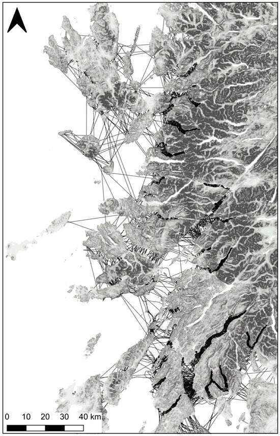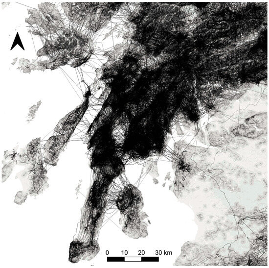 November 2022 was the cut-off for the inclusion of data, and 66 tags were still transmitting data at the cut-off date, but only 42 were still in their dispersal phase; all movements were censored by territory settlement [5]. Tracks from the tag records were created by joining sequential locations and filtering out track fragments that did cross open water. Rarely, there would be a large time gap in the records, and sequential records could be separated by many hours; if the interval was more than three hours, that portion of track was removed. GPS/GSM tags can produce records at a rate of one per minute [62,63]. Despite this intensity of data supply and other tags’ data without such frequent records, some tracks over stretches of sea were composed of multiple tracks, so they were combined into a single track to avoid creating many shorter tracks for one sea crossing. Tracks crossing any stretch of sea were clipped at the coast, and their lengths and day number recorded. The day number was the day in the year: for example, 1 February is day 32.