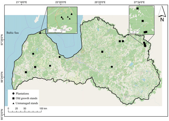 Location of the studied sampling plots of plantations, unmanaged and old-growth stands of Norway spruce in Latvia.