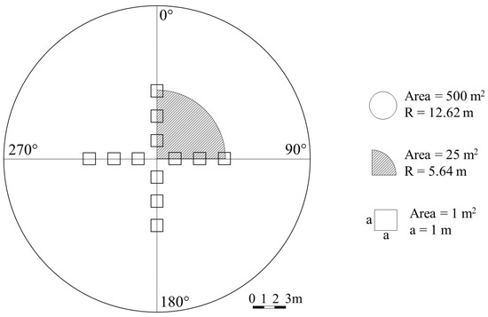 In each stand, depending on the size, two to four circular plots with an area of 500 m2 were established (Figure 2); accordingly, 15, 28 and 24 plots in the PL, UM and OG stands were set up, respectively. Within each plot, the dimensions (height and diameter at breast height) and positions of all trees (living and dead) with the diameter at breast height (DBH) exceeding 6 cm were measured. The dimensions of undergrowth and advanced growth with DBH of 2.1–6.0 cm were measured in a 90° segment of a 100 m2 subplot (with a common centre; Figure 2). For the lying deadwood thicker than 6 cm (thick end), the length and diameter at the thin and thick end within the margins of the sample plot (intersected by the plot) were measured. The surveys and sampling were conducted from 2020 to 2023.