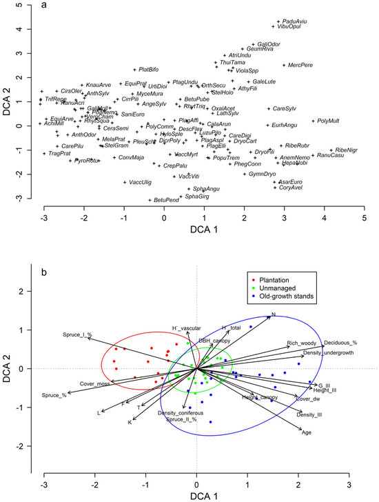 DCA ordination of ground cover vegetation species (a) and sample plots (b) according to their projective (relative) cover in plantations, unmanaged and old-growth stands of Norway spruce in Latvia. Species’ acronyms (eight letters) are used according to [64]. Vectors show the correlation between the principal two gradients represented by the scores of DCA and site properties. Abbreviations of vector names: L—light, K—continentality, F—moisture, T—temperature, N—nitrogen, H′_total—Shannon–Wiener diversity index of all species, H′_vascular—Shannon–Wiener diversity index of vascular species, Rich_woody—richness of woody species, Cover_moss—cover of bryophyte layer, Cover_dw—cover of deadwood on ground, DBH_canopy—diameter at breast height of canopy tree, Height_canopy—canopy height, Height_III—understorey height, Density_III—understorey density, Density_coniferous—density of coniferous trees, Density_undergrowth—density of undergrowth, G_III—basal area of undergrowth, Deciduous_%—proportion of deciduous trees, Spruce_%—proportion of spruce, Spruce_I_%—proportion of spruce in canopy, Spruce_II_%—proportion of spruce in second canopy layer, Age—stand age. Note that scales differ between the panels.