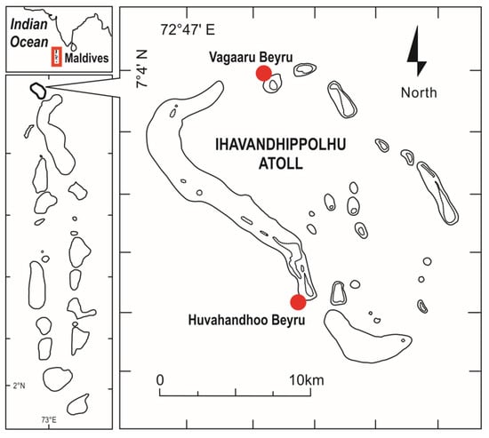- Bianchi, C.N.; Colantoni, P.; Geister, J.; Morri, C. Reef geomorphology, sediments and ecological zonation at Felidu Atoll, Maldive Islands (Indian Ocean). In Proceedings of the 8th International Coral Reef Symposium, Panama City, Panama, 24–29 June 1996; Lessios, H.A., MacIntyre, I.G., Eds.; Smithsonian Tropical Research Institute: Calz. de Amador, Panama, 1997; Volume 1, pp. 431–436. [Google Scholar]