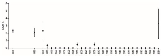 Historical reconstruction of Millepora spp. sightings in the Maldives. Where only one colony was documented, a % cover of 0.5% was assigned. Note that the scale on the x-axis is not uniform. Data sources: 1957 [29]; 1993 [30]; 1997–2014 [22]; 2015–2023 [24,31,32]; 2024 (this study).