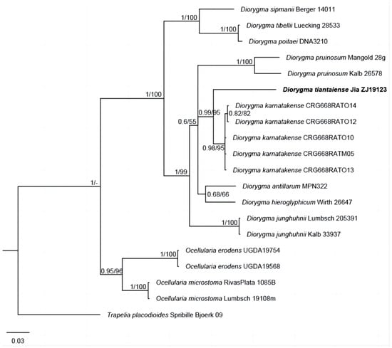 The ML phylogeny inferred from nuLSU sequences of Diorygma tiantaiense and closely related species (with Trapelia placodioides Spribille Bjoerk 09 as outgroup). The evolutionary tree was inferred by using the Bayesian method based on the GTR+I+G model. Bootstrap support values are given on the side of nodes. BI-PP > 0.95 (left) and ML-BS > 70% (right) are considered to be strongly supported. The newly generated sequence is in bold.