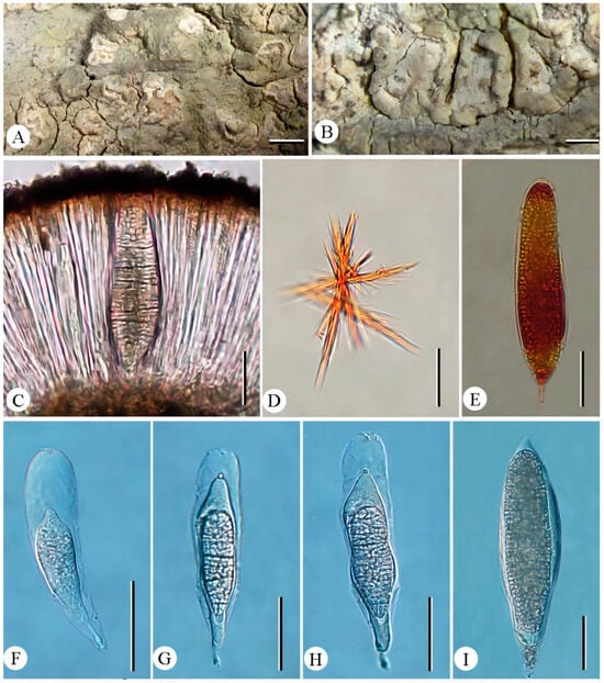Figure 2. Diorygma tiantaiense (holotype, ZJ19123): (A,B) thallus with ascocarps; (C) apothecium section; (D) norstictic acid crystals by using 10% potassium hydroxide; (E) ascus in Lugol’s solution; (F–I) asci in various developmental stages. Scale bars: (A) = 2 mm; (B) = 0.5 mm; (C) = 50 µm; (D) = 20 µm; (E–I) = 50 µm.MycoBank: MB 852800Diagnosis: Differs from Diorygma karnatakense by its ascocarps ± raised when mature, whitish to greyish disc, divergent exciple, ascospores 1/ascus, I–, and the absence of salazinic acid.Type: China, Zhejiang Province, Tiantai County, Huading National Forest Park, on bark of Rhododendron simsii Planch., 29°15′16″ N, 121°05′30″ E, alt. 950 m, 27/IV/2019, Z.F. Jia ZJ19123 (Holotype, LCUF; GenBank MW750692 for LSU).Etymology: The species epithet refers to the locality of holotype.Description: Thallus corticolous, crustose, pale grey to greenishgrey, 100–130 µm thick, surface uneven to slightly rugose, without soralia or isidia; algal layer 40–60 µm thick; medulla poorly developed. Ascocarps numerous, oval or oblong, flexuous and branched, immersed in the thallus when young, becoming open and ± raised when mature, whitish to greyish, rounded at the ends, 0.5–3 × 0.4–2 mm; disc surrounded by entire raised thalline margins, open, rarely convex, with thick and white pruina, sometimes sparse; exciple divergent, laterally uncarbonized, basally and laterally brownish, consisting of a weakly and irregularly or brownish hyphal tissue intermingled with parts of the substrate; hymenium 150–220 µm high, not inspersed, I–; epithecium usually distinctly developed, consisting of intermingled anastomosing, hyaline or brownish paraphysis tips with short ± globular cells, hyaline granules, and dead hyphae; paraphyses 1–2 µm diam., with a gelatinous wall, often anastomosing, especially in the upper part of the hymenium and near the asci, sometimes branched at the tip. Ascospores 1/ascus, hyaline, muriform, dense spore locules of equal size, 120–210 × 35–60 µm, I–, with thin halo.Chemistry: K+ red, P+ yellow to red; norstictic acid.Ecology and distribution: This species is distributed in a subtropical forest in the southeast of China, growing on bark. The type location is in China.Additional specimen examined: China. Zhejiang Province, Tiantai County, Huading National Forest Park, on bark of Rhododendron simsii, 29°15′16″ N, 121°05′30″ E, alt. 950 m, 27/IV/2019, Z.F. Jia ZJ19124, ZJ19125 (LCUF).Discussions: Diorygma tiantaiense is characterized by the oval or oblong apothecia, the large muriform ascospores (20–210 × 35–60 µm) and the presence of norstictic acid only. The species is shown as sister to the clade consisting of D. karnatakense, but different in the latter having concealed and brownish black disc, convergent exciple, I+ in hymenium, ascospores 1–8/ascus, longer ascospores (75–220 × 18.5–51.5 µm), I+ blue violet, and the presence of salazinic acids []. Morphologically, it resembles D. africanum Kalb, Staiger & Elix, D. reniforme (Fée) Kalb, Staiger & Elix, D. salvadoriense Kalb, Staiger & Elix, and D. soozanum (Zahlbr.) M. Nakan. & Kashiw. in ascocarps, but is distinguished from those species by D. africanum having protocetraric acid and the absence of norstictic acid, D. reniforme having larger ascospores (110–230 × 35–80 µm) and the presence of norstictic, protocetraric, and salazinic acids, D. salvadoriense having wider ascospores (150–200 × 50–75µm) and the presence of norstictic and salazinic acids, D. soozanum having thick white pruinate discs and the presence of norstictic and connorstictic acids [].