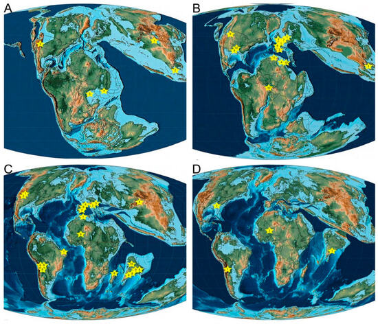 - Scotese, C.R. Atlas of Jurassic Paleogeographic Maps, PALEOMAP Atlas for ArcGIS, Maps 32–42, The Jurassic and Triassic, Mollweide Projection; PALEOMAP Project: Evanston, IL, USA, 2014; Volume 4, 13p. [Google Scholar]