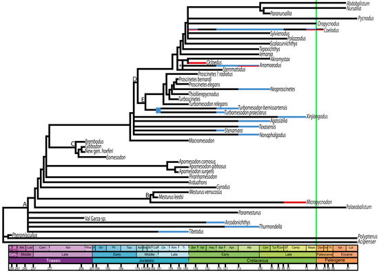 - Benedetto, J.L.; Sanchez, T. Coelodus toncoensis nov. sp. (Pisces, Holostei, Pycnodontiformes) de la Formacion Yacoraite (Cretacico superior) de la provincia de Salta. Ameghiniana 1972, 9, 59–71. [Google Scholar]