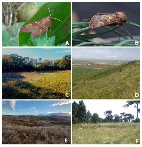 (A) Gortyna borelli from Viișoara; (B) Gortyna borelii from newly discovered site near Aphida; (C) the species’ habitat in Cefa; (D) the species’ habitat in Viișoara; (E) the species’ habitat in Apahida; (F) the species’ habitat in the Domogled Mountain.