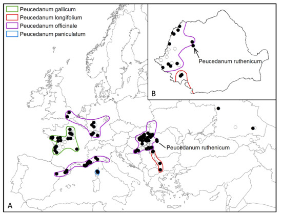 (A) Distribution of Gortyna borelii in Europe (adapted from [10,67], modified and corrected), indicating Peucedanum species specific to the larvae in various geographical regions. Circles represent records prior to 1980, while black dots represent records after 1980; (B) records of Gortyna borelii from Romania are provided, along with indications of Peucedanum species on which its larvae feed in different geographical areas.