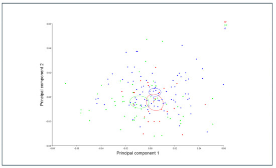 PCA1 and PC2 for all individuals in the study, with Confidence Ellipses for means at a 90% probability. Red-Apahida, green-Cefa, and blue-Viișoara.