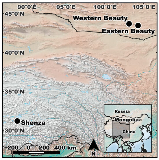 Sampling sites for the Pallas’s cat (Otocolobus manul) scats included in this study. Scats were collected in Shenza, Tibet Autonomous Region (n = 1) and the Western and Eastern Beauties of Mongolia (n = 2 and n = 3, respectively) during noninvasive genetic surveys.