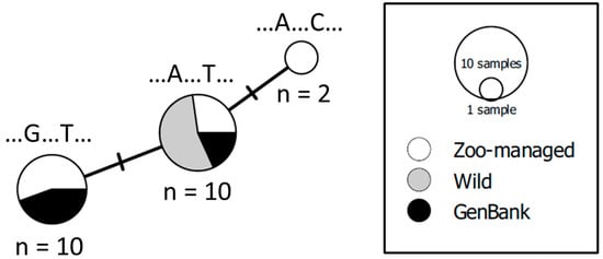 Minimum spanning network of Pallas’s cats (Otocolobus manul) at the mitochondrial 12S ribosomal RNA (MT-RNR1; 91 bp) locus. Sequences originated from six wild and ten zoo-managed cats sequenced in this study and six additional sequences from NCBI’s GenBank (n = 22). The wild Pallas’s cat scats were collected in Shenza, Tibet Autonomous Region (n = 1) and the Western and Eastern Beauties of Mongolia (n = 2 and n = 3, respectively). The white, gray, and black coloration of the haplotypes correspond to zoo-managed, wild, and GenBank individuals, respectively. Shared haplotypes are split proportionally based on the number of sequences collected from wild specimens, zoo-managed specimens, or sequences available through GenBank. Each solid branch represents one mutational step between haplotypes. For each haplotype, the nucleotide present at each segregating site is listed above.