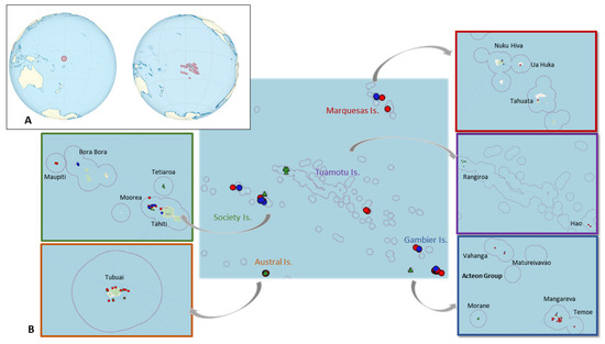 (A): Position of Tuvalu islands (left) and French Polynesia archipelagos (right) in the Pacific Ocean (source: TUBS from CC BY-SA 3.0, https://commons.wikimedia.org/wiki/Main_Page, accessed on 25 January 2024); (B): Distribution maps of samples from French Polynesia used in this study, with a zoom to the five archipelagos. Red dots are samples successfully sequenced, blue dots are specimens for which DNA was not available, and green triangles are samples from GenBank, including specimens from [13].