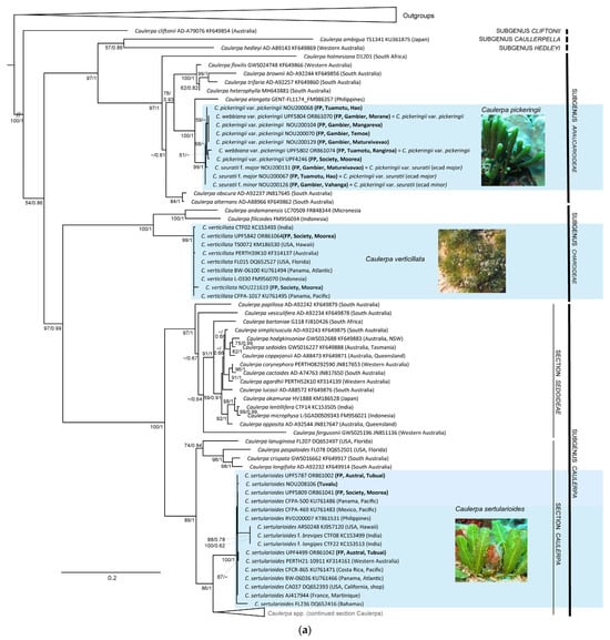 A total of 344 sequences were included in our phylogenetic analyses, including 134 newly produced sequences (110 from French Polynesia specimens, 20 from Tuvalu specimens, and four from other localities), of which 47 (unique haplotypes) were deposited in the GenBank database (OR891689-OR891717 and PP313086-PP3130103). The general tree topology (Figure 2a–c) is globally consistent with previous publications (except that no outgroup and no subgenus Charoideae representatives were used in [30] and except for the subgenus Charoideae position in [2]), although here the subgenus Cliftonii is the first to diverge from the rest of the Caulerpa species, albeit only weakly supported in the ML tree (bs = 54). There are then two strongly supported clades, one consisting of the subgenera Caulerpella, Hedleyi, and Araucarioideae (bs = 97; PP = 1), and a second consisting of the subgenera Charoideae and Caulerpa (bs = 97; PP = 0.99). A total of 69 species have been represented in our phylogenetic analyses, of which 13 are found in French Polynesia. From these 13 species, nine are strongly supported (bs ≥ 90; PP ≥ 0.98): C. bikinensis, C. chemnitzia, C. nummularia, C. oligophylla, C. racemosa, C. sertularioides, C. taxifolia, C. verticillata, and C. webbiana., C. urvilleana is moderately supported (bs = 0.79; PP = 0.94). C. serrulata (bs < 80) is not monophyletic in the BI tree (cf. Supplementary Figure S1) and C. cupressoides is not monophyletic in both trees. Finally, C. seuratii is not monophyletic and closely related to sequences assigned to ‘C. webbiana var. pickeringii’ in [13].