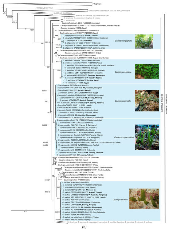 - Draisma, S.G.A.; Prud’homme van Reine, W.F.; Sauvage, T.; Belton, G.S.; Gurgel, C.F.D.; Lim, P.E.; Phang, S.M.A. Re-Assessment of the Infra-Generic Classification of the Genus Caulerpa (Caulerpaceae, Chlorophyta) Inferred from a Time-Calibrated Molecular Phylogeny. J. Phycol. 2014, 50, 1020–1034. [Google Scholar] [CrossRef] [PubMed]