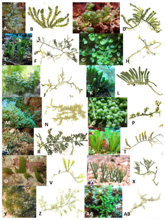 Illustrations of Caulerpa species found in French Polynesia. (A,B): Caulerpa bikinensis; (C,D): Caulerpa chemnitzia; (E,F): Caulerpa cupressoides; (G,H): Caulerpa nummularia; (I,J): Caulerpa oligophylla; (K,L): Caulerpa pickeringii var. pickeringii; (M,N): Caulerpa pickeringii var. seuratii; (O,P): Caulerpa racemosa; (Q,R): Caulerpa serrulata; (S,T): Caulerpa sertularioides; (U,V): Caulerpa taxifolia; (W,X): Caulerpa urvilleana; (Y,Z): Caulerpa verticillata; (AA,AB): Caulerpa webbiana.