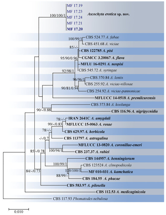 Phylogenetic tree of Ascochyta species inferred from a maximum likelihood analysis based on a concatenated alignment of ITS, 28S, rpb2, and tub2. The maximum likelihood bootstrap support values (MLBS ≥ 70%), maximum parsimony bootstrap support values (MPBS ≥ 70%), and Bayesian posterior probabilities (BPP ≥ 0.70) are given at the nodes (MLBS/MPBS/BPP). Tree is rooted by Phomatodes nebulosa (CBS 117.93). The studied isolates are in blue, and the ex−type and representative strains are in bold.