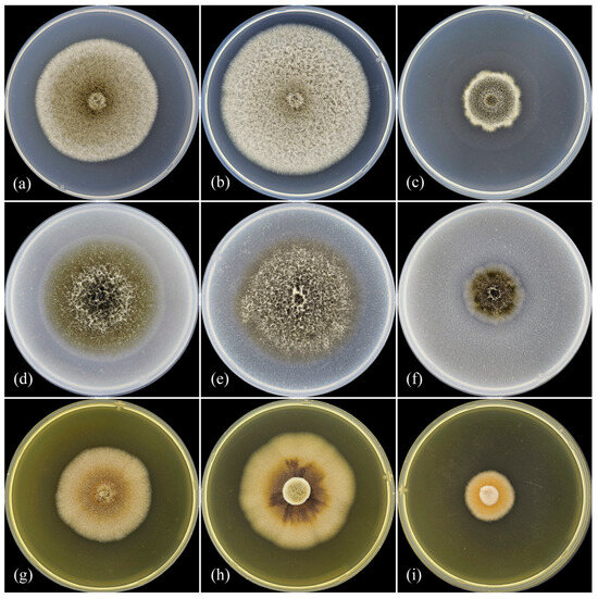 Ascochyta erotica sp. nov. (ex-holotype culture MF-17.20). Colonies grown at different temperatures on various media after 10 days of growth. (a) PDA, 20 °C; (b) PDA, 25 °C; (c) PDA, 30 °C; (d) OA, 20 °C; (e) OA, 25 °C; (f) OA, 30 °C; (g) MEA, 20 °C; (h) MEA, 25 °C; (i) MEA, 30 °C.