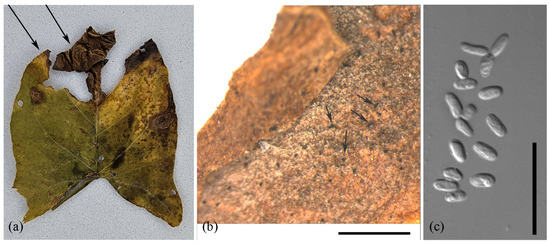 Ascochyta erotica sp. nov. from the holotype material LEP 124536. (a) Necrotic lesions on Convolvulus arvensis leaf; (b) pycnidia on necrotic lesion; (c) conidia. Scale bars: (b) 1 mm; (c) 20 µm. Arrows indicate pycnidia.
