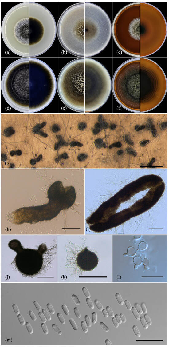 Ascochyta erotica sp. nov. (ex-holotype culture MF-17.20). (a) Culture on PSA after 7 d of growth (front and reverse); (b) culture on OA after 7 d of growth (front and reverse); (c) culture on MEA after 7 d of growth (front and reverse); (d) culture on PSA after 14 d of growth (front and reverse); (e) culture on OA after 14 d of growth (front and reverse); (f) culture on MEA after 14 d of growth (front and reverse); (g–k) pycnidia from OA after 14 d of growth; (l) conidiogenous cells; (m) conidia. Scale bars: (g), 500 µm; (h,i), 100 µm; (j,k), 200 µm; (l,m), 20 µm.