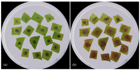 The pathogenicity of Ascochyta erotica sp. nov. was tested using C. arvensis leaf segments (Table 4, Figure 5). The first significant symptoms were observed at 3 dpt (with the exception of MF-17.24) on the abaxial sides of the leaf segments, both wounded and intact. The adaxial sides were less susceptible to infection, and symptoms were recorded at 3 dpt only in the wounded leaf segments. At 7 dpt, a significant increase in the size of the developed necrosis was detected. The necrosis that developed was also observed when the inoculum was applied to the intact adaxial sides of the leaves. To confirm Koch’s postulates, fungal cultures were reisolated in all cases from the necrosis formed on leaf segments. These isolates had morphological characteristics identical to those of all the isolates tested.
