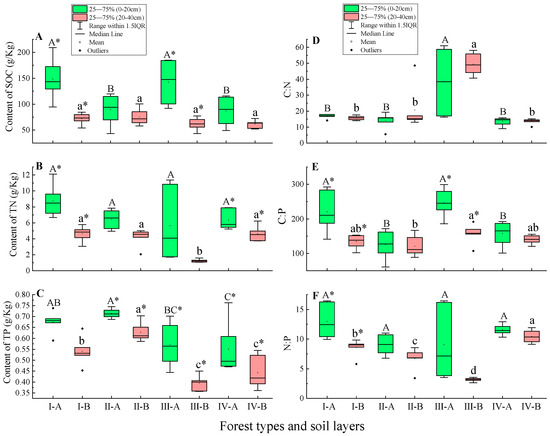 SOC, TN, and TP stoichiometric indexes of 0–20 cm and 20–40 cm soil layers in four forest types. Ⅰ, C. fargesii; Ⅱ, C. multiervis; Ⅲ, C. argyrotricha; Ⅳ, R. argyrophyllum. A of X-axis, 0–20 cm soil layer; B of X-axis, 20–40 cm soil layer. Subfigure (A), content of SOC; subfigure (B), content of TN; subfigure (C), content of TP; subfigure (D), ratio of C:N; subfigure (E), ratio of C:P; subfigure (F), ratio of N:P. Different lowercase letters indicate significant differences at p < 0.05 among the 20–40 cm soil layer in four forest types; different uppercase letters indicate significant differences at p < 0.05 among the 0–20 cm soil layer in four forest types. * indicates significant differences between the 0–20 cm soil layer and 20–40 cm soil layer at the same forest type (p < 0.05).