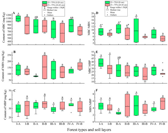 In the same soil layer, there was no significant difference in soil MBC:MBN ratio and MBN:MBP ratio between different forest stands (p > 0.05) (Figure 3D,F); within the same forest type, there was no significant difference in soil MBC:MBP ratio and MBN:MBP ratio between different soil layers (p > 0.05) (Figure 3D–F).
