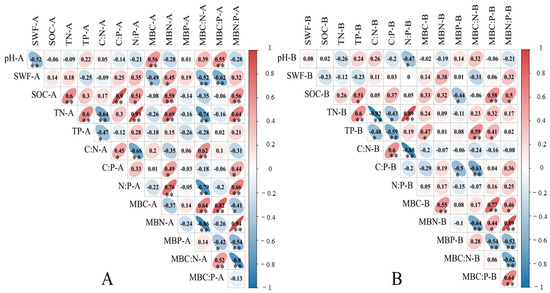 Pearson’s correlation heatmap of between soil microbial biomass carbon, nitrogen, and phosphorus and its ecostoichiometric ratio in the 0–20 cm soil layer (A) and 20–40 cm soil layer (B). Note: * represents significant difference at 0.05 level; ** represents significant difference at 0.01 level; the number axis represents the magnitude of the correlation coefficient value, where red denotes a positive correlation and blue denotes a negative correlation.