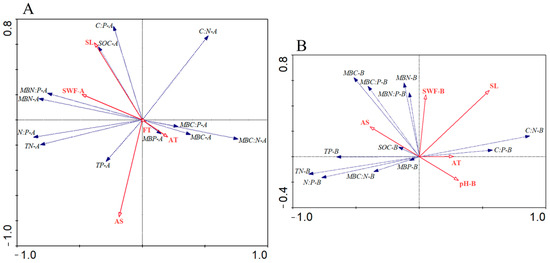 Biplots of redundancy analysis. Note: Biplots of redundancy analysis to show associations between environmental variables and C:N:P ecological stoichiometry in soil and microbial biomass of 0–20 cm (A) and between environmental variables and C:N:P ecological stoichiometry in soil and microbial biomass of 20–40 cm (B). Arrows pointing in the same direction indicate variables that are positively correlated, whereas arrows pointing in opposite directions indicate variables that are negatively correlated. Abbreviations: FT, forest type; SWF, water accommodated fraction; AT, altitude; AS, aspect; SL, slope; SOC, soil organic carbon; TN, total nitrogen; TP, total phosphorus; MBC, microbial biomass C; MBN, microbial biomass N; MBP, microbial biomass P.