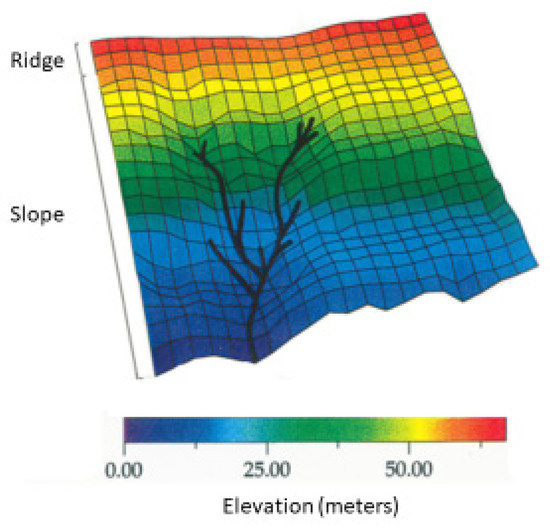 Each 5 × 5 m subunit was classified as belonging to one of three topographic microhabitats: ridge, erosion gully, or slope (Figure 1). The ridge microhabitat is the least steep terrain of the study plot, with relative altitudes of 59–67 m from the lowest point; it is limited to the first four rows of 5 × 100 m. The extension of this microhabitat is 1775 m2 (18% of the plot). The slope microhabitat is the rough part of the plot area, located at altitudes of 0–58.9 m. The extension of this zone is 7025 m2 (70% of the plot). The erosion gully bed is the only microhabitat that has bare rocks as part of the soil structure with rivulets running through it. The extension of this microhabitat is 1200 m2 (12% of the plot) at altitudes of 0–54 m.