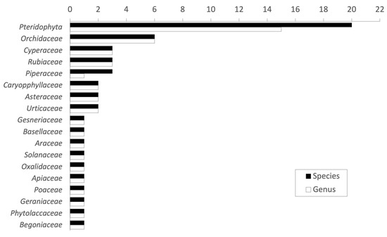 Genus and species richness for the 18 herb families found in the one-hectare plot in the Pasochoa volcano. The pteridophytes are represented by one group.