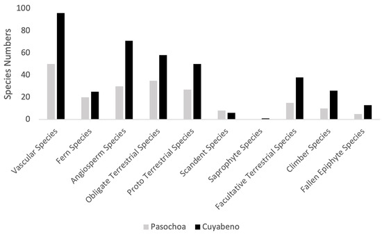 Concerning the entire group of herb species, botanical accounts document that species richness increases with increasing altitude, reaching a maximum at 2400–3000 m [52]. However, in small areas like the one-hectare study at Cuyabeno, this pattern is the opposite: Cuyabeno included nearly twice as many species in comparison to Pasochoa at this scale (Figure 3). Whitmore and collaborators (1985) [12] used a category of free-standing herbs, which is equivalent to obligate terrestrials in the present study (Table 2). Gentry and Dodson (1987) [1] as well as Linares-Palomino and collaborators (2009) [19] used the classification of “terrestrial herbs”, which is the same as our obligate terrestrials, as the authors had separate categories for climbers and for epiphytes. Comparing the species richness of these studies with the Pasochoa plot (Figure 3, Table 2), we conclude that the Pasochoa plot had the lowest species richness, except if it would be compared with the dry forest of Jauneche located on the coast of Ecuador. This make sense, considering that most herb species, especially ferns, thrive in humid habitats.