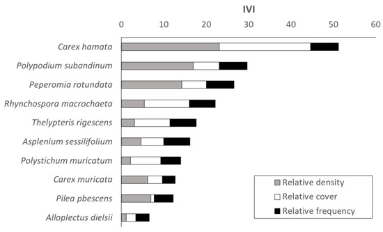 The Importance Value Index (IVI) for the 10 most important species (Figure 4) varies from 50 for Carex hamata to 8 for Alloplectus dielsii. Of these 10 species, 8 are prototerrestrials and 2 are climbers.