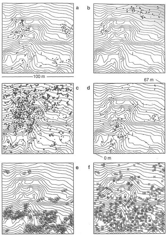 Examples of the topographic distribution of four species of herbs found in the study area: (a) Begonia sodiroi, climber, N = 428; (b) Hydrocotyle alchemilloides, prototerrestrial, N = 260; (c) Carex hamata, prototerrestrial, N = 7116; (d) Asplenium pteroporus, prototerrestrial, N = 347. (e) Low light microhabitats (thicket) and (f) medium light intensity microhabitats. Level curves each 2 m.