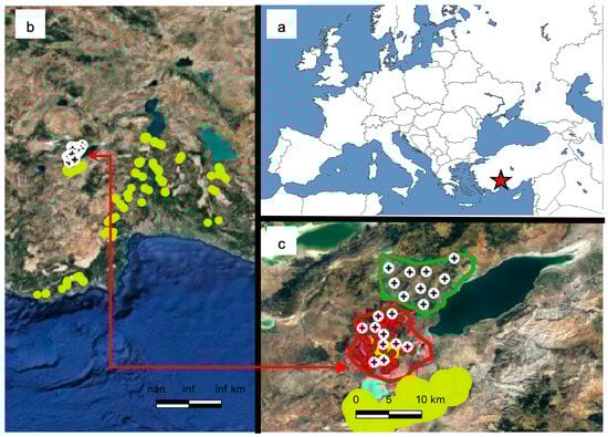 Western Taurus is the study area and the areas where the photo-trapping study will be conducted. (a): Study area location; red star (b): yellow dots are randomly selected marble quarries in western Taurus; (c): areas where the photo-trap study is conducted; red dots are marble quarries in MQA, green line is the control area, and plus signs are the photo-trap locations.