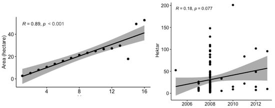 It was calculated that the average area of a marble quarry from the first year of activity of the 97 selected marble quarries from western Taurus in the 5th, 10th, and 15th years is 13.34 ± 15.89 (n = 97), 24.88 ± 29.66 (n = 91), and 49.20 (n = 1) hectares, respectively. A statistically significant positive correlation was found between each year of operation and the covered area of these years, which were determined using Google Earth Timelapse (R = 0.89, p < 0.01; Figure 2 left). Also, a non-significant but positive correlation was found between the year in which activity started and the currently covered area of the quarries (R = 0.18, p = 0.07; Figure 2 right).
