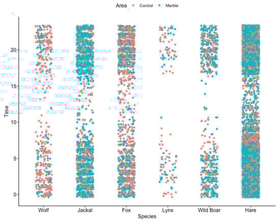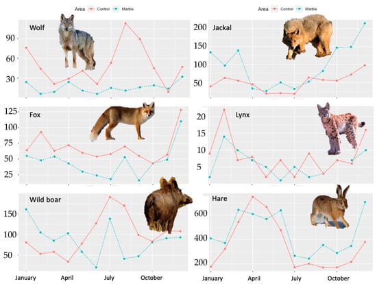 Jackals and hares were found to be more abundant in the marble quarries than in the control area. It is thought that this is due to the fact that jackals usually feed on human waste caused by human activities. Ćirović et al. [] found that 71.8% of the jackal’s diet was human waste. The fact that the jackal was more abundant in the marble quarry area is probably due to the fact that its predators, wolf, fox, and lynx, are less abundant in this area compared to the control area, as well as to the absence of illegal hunters, since the marble quarries are in operation around the clock.