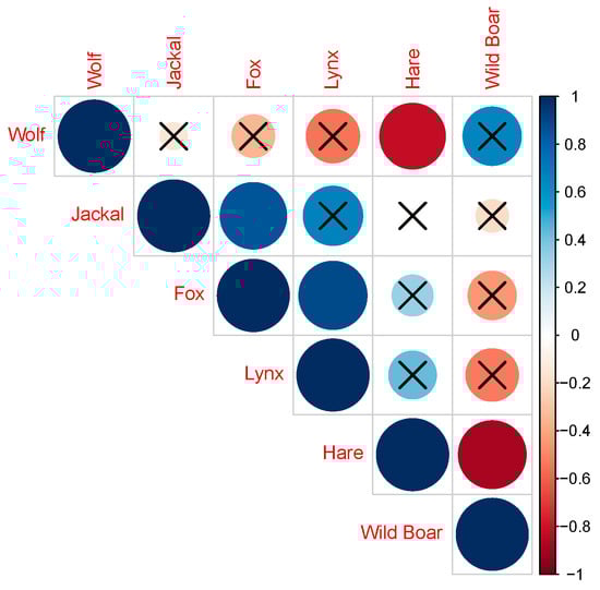 Pearson correlation between target species. The color indicates the R value, the size of the circle indicates the p-value, and the cross indicates non-significant values (p > 0.05).