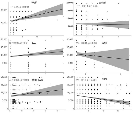 We found a positive correlation between the distance of the photo-trap site from the center of the quarries and their daily total individuals of wolves, foxes, and wild boars. The wolves (R = 0.21, p < 0.01), foxes (R = 0.09, p < 0.01), and wild boars (R = 0.09, p < 0.05) were affected by the marble quarries and were found at a greater distance from the quarry center (Figure 6). While there was no statistical correlation for jackals and lynxes, a negative correlation was found for hares (Figure 6).