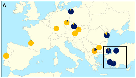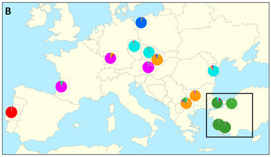 Map indicating the populations of pumpkinseed Lepomis gibbosus compared in this study. Populations from Türkiye are marked by black frames. Based on the STRUCTURE analysis, dividing into two (A) and six (B) clusters (marked by different colours) was identified as the best-supported model of population structuring.