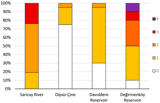 Maximum parasite prevalence (100%) was found in the Sarıçay River (Table 4). The IC species richness ranged from 0 to 4 per fish. All types of infracommunities were observed only in Değirmenköy Reservoir. Three species IC were found in the Sarıçay River, while two species IC were observed in the Dipsiz-Çine Stream and Davuldere Reservoir (Figure 2). Two parasite species occurred as strongly interactive in the parasite community, i.e., O. dispar in the Davuldere Reservoir and P. centrarchi in the Sarıçay River. Both species had a clear tendency to join the community in Değirmenköy Reservoir, together with larval nematodes Aquariidae gen. sp. In the Dipsiz-Çine Stream, all parasite taxa were moderately interactive (Table 5).