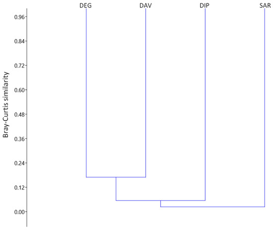 Dendrogram on Bray–Curtis similarity between parasite communities of Lepomis gibbosus at four localities in Turkey. DEG—Değirmenköy Reservoir, DAV—Davuldere Reservoir, DIP—Dipsiz-Çine Stream, SAR—Sarıçay River.