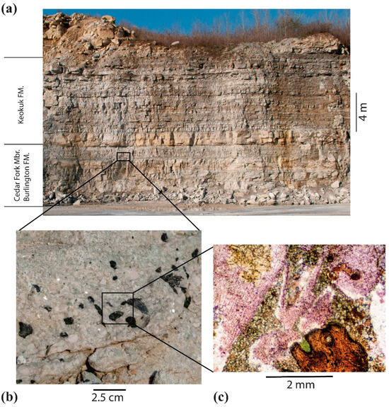 - Witzke, B.J.; McKay, R.M.; Bunker, B.J.; Woodson, F.J. Stratigraphy and paleoenvironments of Mississippian strata in Keokuk and Washington Counties, southeast Iowa. In Guidebook Series, No. 10; Iowa Department of Natural Resources: Des Moines, IA, USA, 1990; p. 106. Available online: https://publications.iowa.gov/id/eprint/25602 (accessed on 1 April 2019).