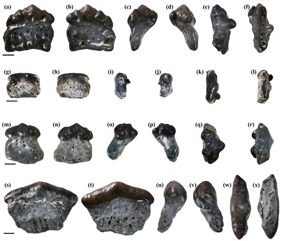 Figure 4. Teeth of Columnaodus witzkei gen. et sp. nov. comprising the hypodigm. (a–f) Holotype, SC2019.44.1. (a) Labial, (b) lingual, (c) mesial?, (d) distal?, (e) occlusal, (f) basal views. (g–l) Paratype, SC2022.35.3. (g) Labial, (h) lingual, (i) mesial?, (j) distal?, (k) occlusal, (l) basal views. (m–r) Paratype, SC2022.35.4. (m) Labial, (n) lingual, (o) distal?, (p) mesial?, (q) occlusal, (r) basal views. (s–x) Paratype, SC2022.35.9. (s) Labial, (t) lingual, (u) mesial?, (v) distal?, (w) occlusal, (x) basal views. Labial at right in (c,e,f,i,k,l,o,q,r,u,w); labial at left in (d,j,p,v,x). Scale bars = 1 mm for all.