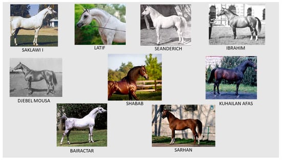 It is well known that for over 100 years, the Arabian horse has been widely used for the “improvement” of many other horse breeds [,,,]. The cumulative influence of a stallion leads to the formation of a “sire line”. These were usually genetically strong fathers who passed on their traits, so they were frequently used for breeding, and their offspring could then be selected accordingly. Therefore, the sire line can only appear over several generations and cannot be “established” as such from the beginning. However, sire lines can be used as a tool to consolidate types, to manage inbreeding or line breeding, and to monitor genetic diversity [,,]. Currently, more than 25 globally active Arabian sire lines exist [].