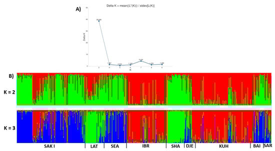The results from the STRUCTURE analysis, implemented by Kopelman et al. [], showed a clear optimum at K = 3 (Figure 2A). This means that all individuals were assigned into three different clusters. Supplementary Table S5 shows the proportion of individuals assigned to each of the three clusters, depending on the Q value that resulted from the STRUCTURE analysis. The first cluster mainly consisted of KUH, where 98.2% of the KUH individuals were assigned into this cluster. This cluster also included many individuals of the IBR and SAR sire lines (98.0% and 94.3%, respectively). The second cluster consisted of 98.2% of SAK I samples and 97.9% of SEA samples, in addition to 96.8% of the BAI lineage. Three different sire lines, 98.0% of SHA, 97.7% of LAT, and 97.2% of DJE, formed the third cluster.