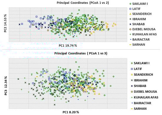 PCoA analysis was applied to examine the relationships among the Arabian horse lineages and between individuals (Figure 3). For better understanding of the distribution of the studied horse samples, we generated two PCoA plots (1 vs. 2 and 1 vs. 3 axes). In general, the PCoA plot supported the data obtained from the STRUCTURE analysis. Because of the low genetic differentiation among all lineages, we did not observe a separation of different sire lines in the PCoA plot (1 vs. 2 axes), although some individuals from different sire lines (LAT and SEA) separated from the overall gene pool. In the PCoA plot (1 vs. 3 axes), we again observed a common genetic pool formed by the studied samples. Unlike in the first option, here, some individuals were separated from the IBR and SAK sire lines.