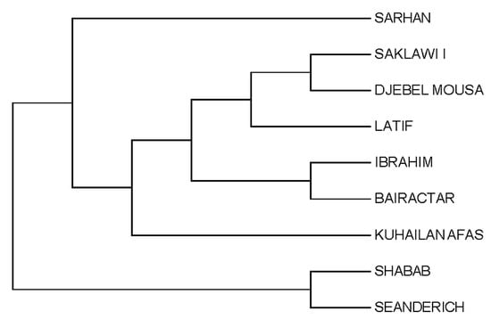 Table 1 summarizes the statistics of the molecular genetic polymorphism in the Arabian horse lineages. A total of 84 distinct alleles were detected at the 13 microsatellite markers in 537 studied animals. The SAK I and LAT sire lines exhibited the highest number of alleles, 72, while the SARHAN lineage showed 54 alleles revealed by microsatellite markers. The private allele list was observed at very low values among all Arabian lineages. The LAT had the largest number of private alleles at 2 (2/84, 2.3%), while in some lineages, such as IBR, BAI, DJE, etc., no private allele was detected. Across the nine Arabian horse lineages, the average number of alleles per locus was 5.19 ± 0.37. The average Ho frequency (0.78) was the highest in the SHA sire line and the lowest in the SEA (0.63) line (Table 1). The average uHe value varied from 0.55 in the SEA line to 0.67 in the SAK and LAT lineages. The heterozygote deficit within populations (FIS) for the two goat breeds showed very low values (KLH, 0.037; BSHL, 0.011), which indicated the absence of inbreeding processes. Also, the mean FIS = −0.109 was highly variable among the studied horse lineages. The confidence intervals (95%) varied from 3.3 to 8.3 for the LAT and IBR lineages, respectively, according to the LD method.