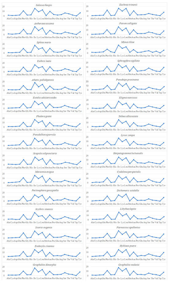 The codon usage analysis of S. thespis showed that Phe, Ile, Leu and Asn were the most frequent amino acids, while Trp was the least (Figure 2). The amino acid distribution of mitochondrial genomes from 30 different Lepidoptera species were compared, and it was found that the distribution of codons in these species was consistent (Figure 2). The relative synonymous codon usage (RSCU) values of 13 PCGs in S. thespis were calculated. The usage of UUA, UCU, CGA, ACU and GCU codons were higher, while CCG, AGG, CUG, ACG and UCG were lower. The usage frequency of AT in the third codon was significantly higher than that of CG, which is highly conserved in insect mitogenomes [,].